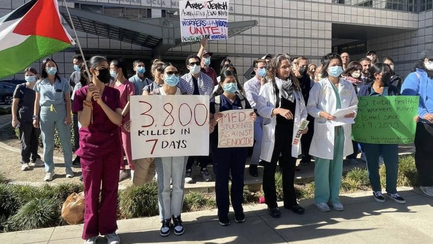 UCLA Med School November 9, 2023. Healthcare workers and medical students across the US have rallied to demand an end to Israel’s genocidal bombing of Gaza and have especially condemned the attacks on health infrastructure and workers. Photo: ANSWER Coalition
